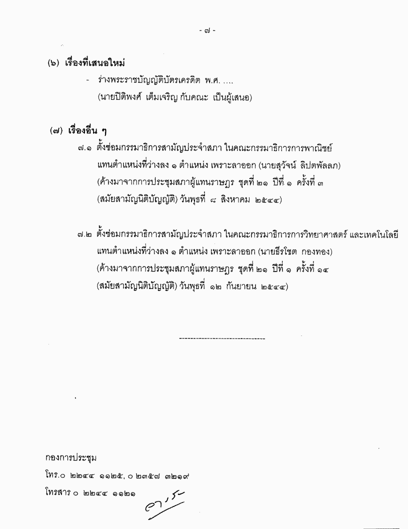 • ระเบียบวาระการประชุมสภาผู้แทนราษฎร ชุดที่ 21 ปีที่ 1 ครั้งที่ 16 (สมัยสามัญนิติบัญญัติ) วันพุธที่ 19 กันยายน 2544