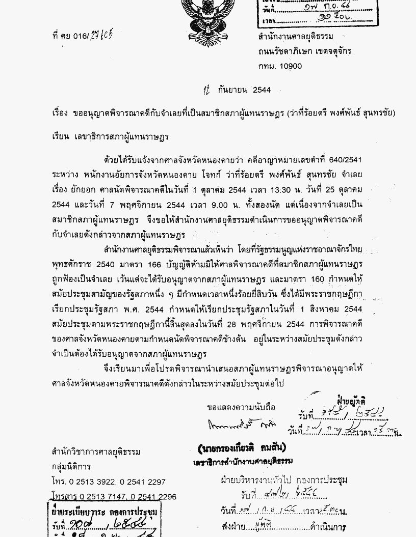 ขออนุญาตพิจารณาคดีกับจำเลยที่เป็นสมาชิกสภาผู้แทนราษฎร (ว่าที่ร้อยตรี พงศ์พันธ์ สุนทรชัย) |