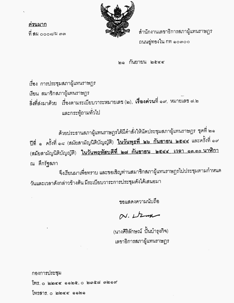 • ระเบียบวาระการประชุมสภาผู้แทนราษฎร ชุดที่ 21 ปีที่ 1 ครั้งที่ 18 (สมัยสามัญนิติบัญญัติ) วันพุธที่ 26 กันยายน 2544