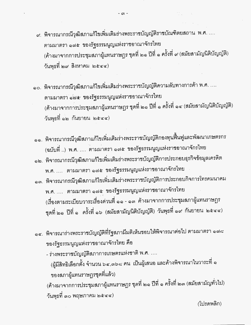 ระเบียบวาระการประชุมสภาผู้แทนราษฎร ชุดที่ 21 ปีที่ 1 ครั้งที่ 18 (สมัยสามัญนิติบัญญัติ) วันพุธที่ 26 กันยายน 2544 |