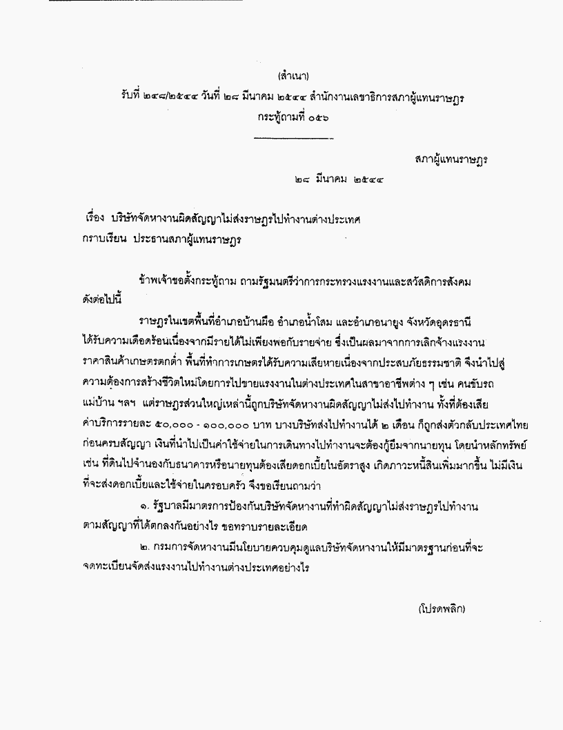 กระทู้ถาม ที่ 056 เรื่อง บริษัทจัดหางานผิดสัญญาไม่ส่งราษฎรไปทำงานต่างประเทศ นายสุรชาติ ชำนาญศิลป์ เป็นผู้ตั้งกระทู้ถาม ถามรัฐมนตรีว่าการกระทรวงแรงงานและสวัสดิการสังคม |