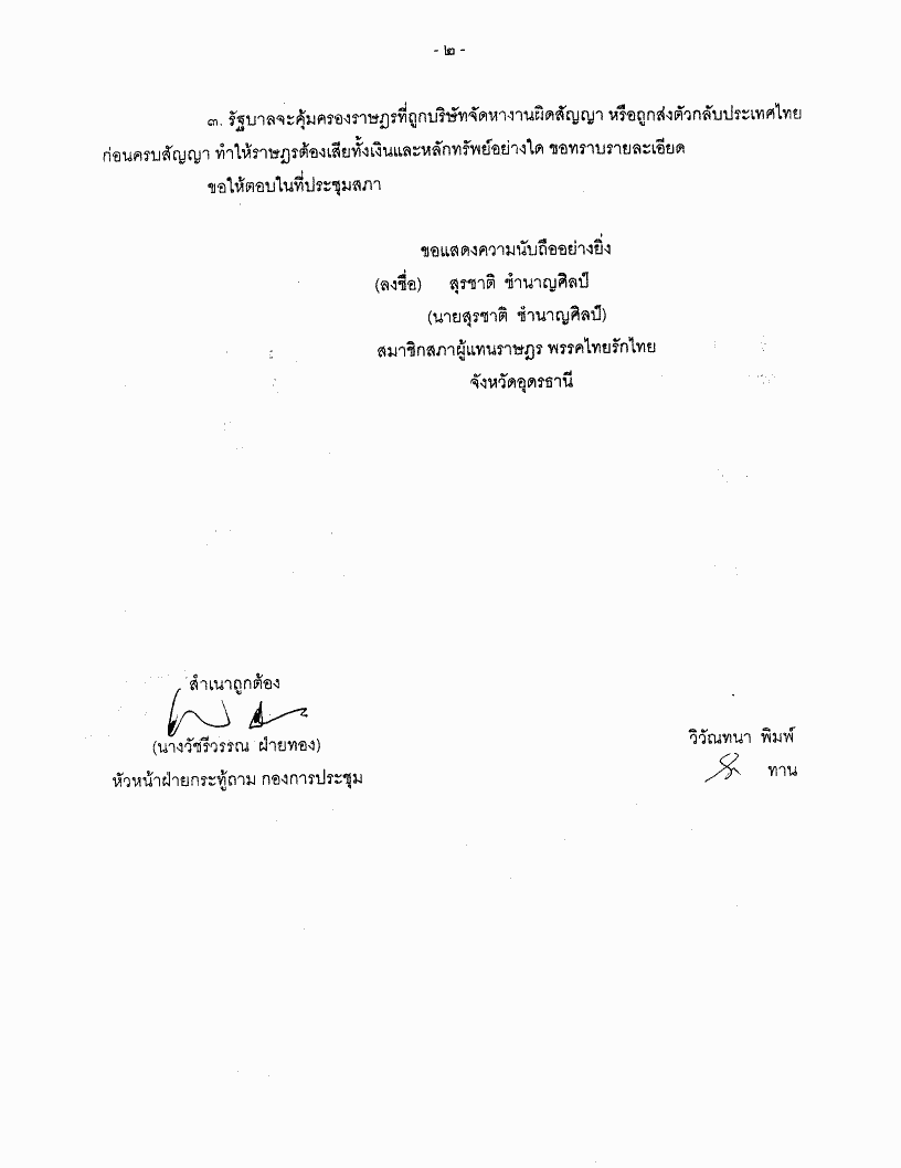 ชื่อเอกสาร :   กระทู้ถาม ที่ 056 เรื่อง บริษัทจัดหางานผิดสัญญาไม่ส่งราษฎรไปทำงานต่างประเทศ นายสุรชาติ ชำนาญศิลป์ เป็นผู้ตั้งกระทู้ถาม ถามรัฐมนตรีว่าการกระทรวงแรงงานและสวัสดิการสังคม