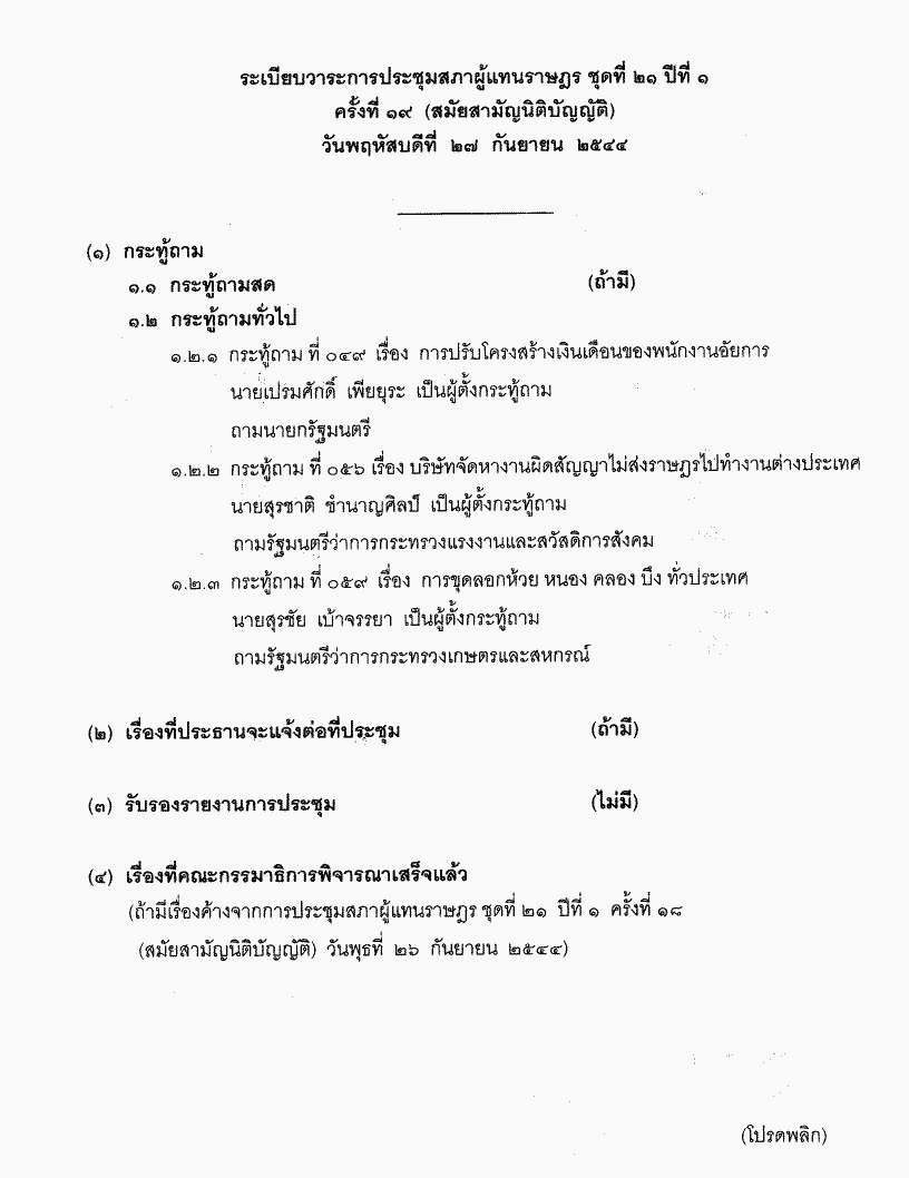 ระเบียบวาระการประชุมสภาผู้แทนราษฎร ชุดที่ 21 ปีที่ 1 ครั้งที่ 19 (สมัยสามัญนิติบัญญัติ) วันพฤหัสบดีที่ 27 กันยายน 2544 |