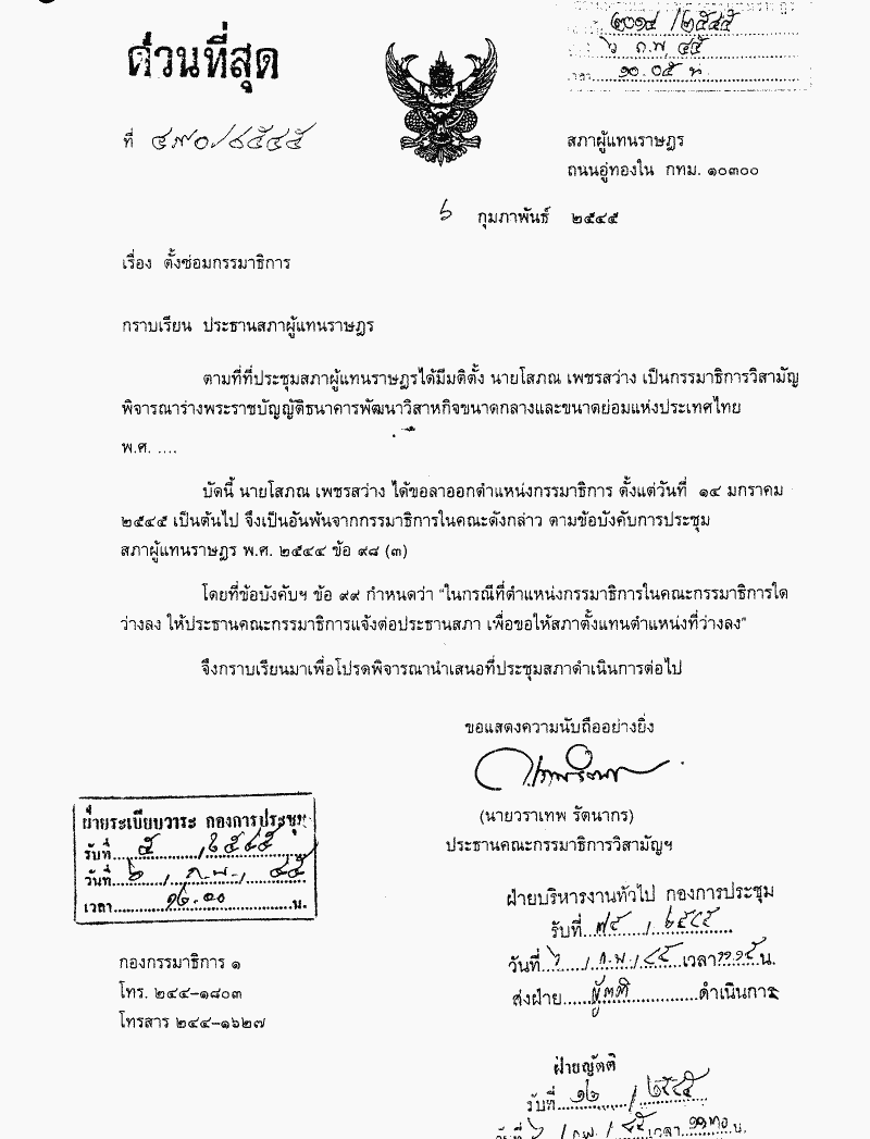 ตั้งซ่อมกรรมาธิการวิสามัญพิจารณาร่างพระราชบัญญัติธนาคารพัฒนาวิสาหกิจ ขนาดกลางและขนาดย่อมแห่งประเทศไทย แทนตำแหน่งที่ว่างลง 1 ตำแหน่ง เพราะลาออก (นายโสภณ เพชรสว่าง) |
