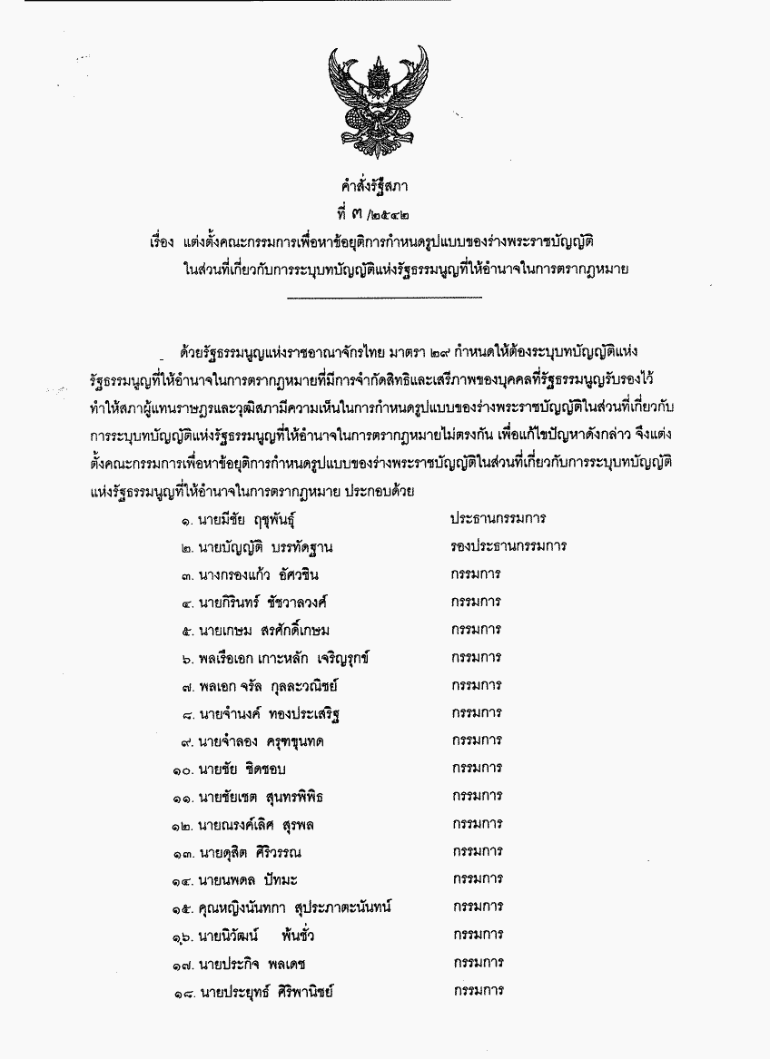 คำสั่งรัฐสภา ที่ ๓ /๒๕๔๒ เรื่อง แต่งตั้งคณะกรรมการเพื่อหาข้อยุติการกำหนดรูปแบบของร่างพระราชบัญญัติ |