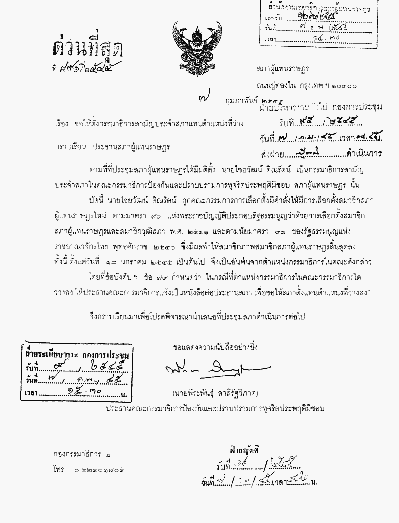ตั้งซ่อมกรรมาธิการสามัญประจำสภา ในคณะกรรมาธิการป้องกันและปราบปราม การทุจริตประพฤติมิชอบ แทนตำแหน่งที่ว่างลง 1 ตำแหน่ง เพราะสมาชิกภาพสิ้นสุดลง (นายไชยวัฒน์ ติณรัตน์) |
