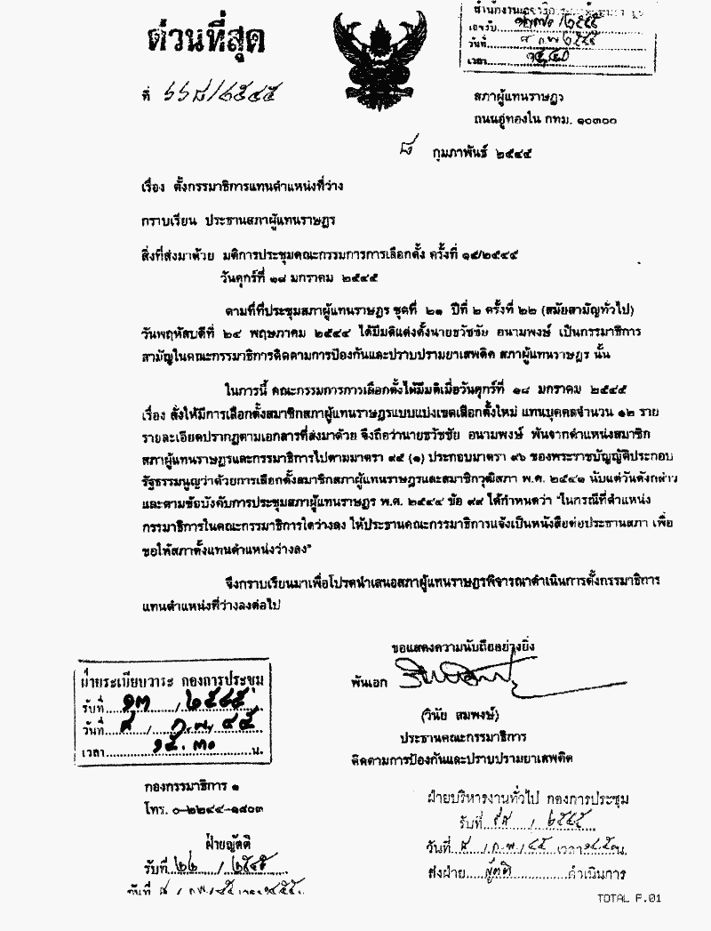 ตั้งซ่อมกรรมาธิการสามัญประจำสภา ในคณะกรรมาธิการติดตามการป้องกันและปราบปรามยาเสพติด แทนตำแหน่งที่ว่างลง 1 ตำแหน่ง เพราะสมาชิกภาพสิ้นสุดลง (นายธวัชชัย อนามพงษ์) |