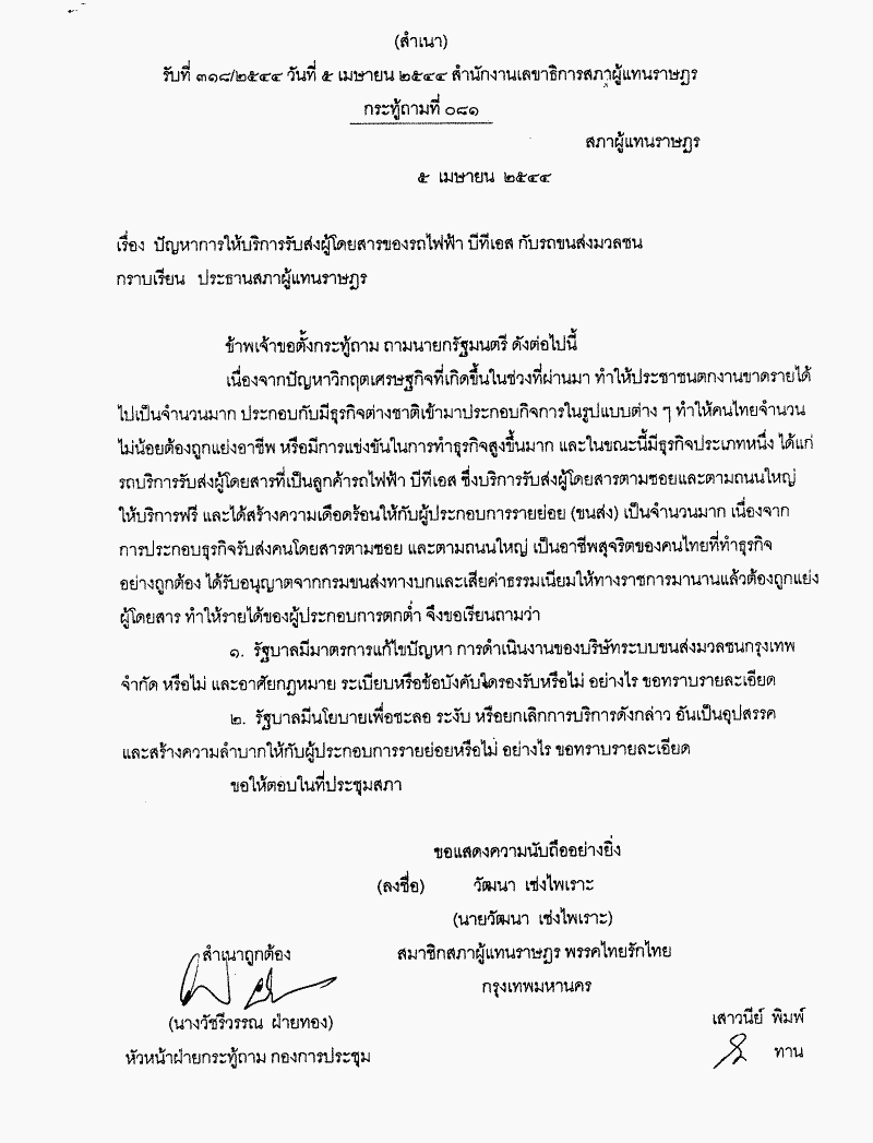 กระทู้ถามที่ 081 เรื่อง ปัญหาการให้บริการรับส่งผู้โดยสารของรถไฟฟ้า บีทีเอสกับรถขนส่งมวลชน นายวัฒนา เซ่งไพเราะ เป็นผู้ตั้งกระทู้ถาม ถามนายกรัฐมนตรี |
