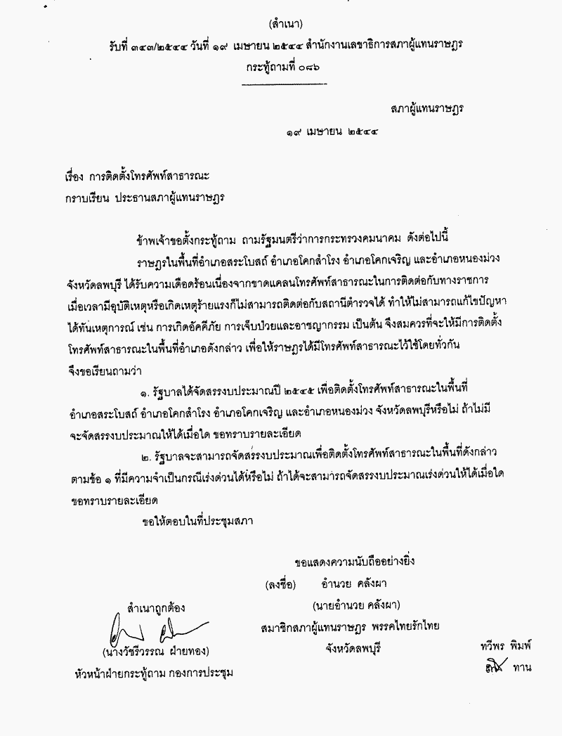 กระทู้ถามที่ 086 เรื่อง การติดตั้งโทรศัพท์สาธารณะ นายอำนวย คลังผา เป็นผู้ตั้งกระทู้ถาม ถาม รัฐมนตรีว่าการ กระทรวงคมนาคม |