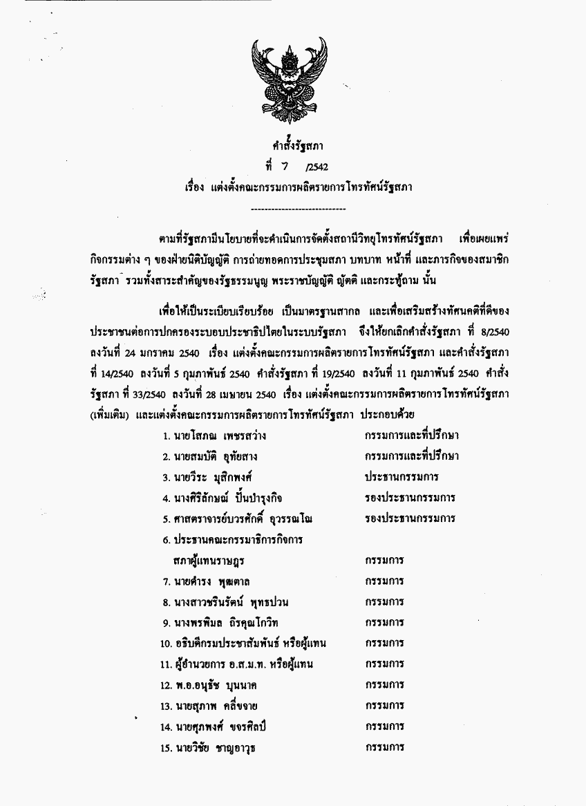 คำสั่งรัฐสภา ที่ 7 /2542 เรื่อง แต่งตั้งคณะกรรมการผลิตรายการโทรทัศน์รัฐสภา |