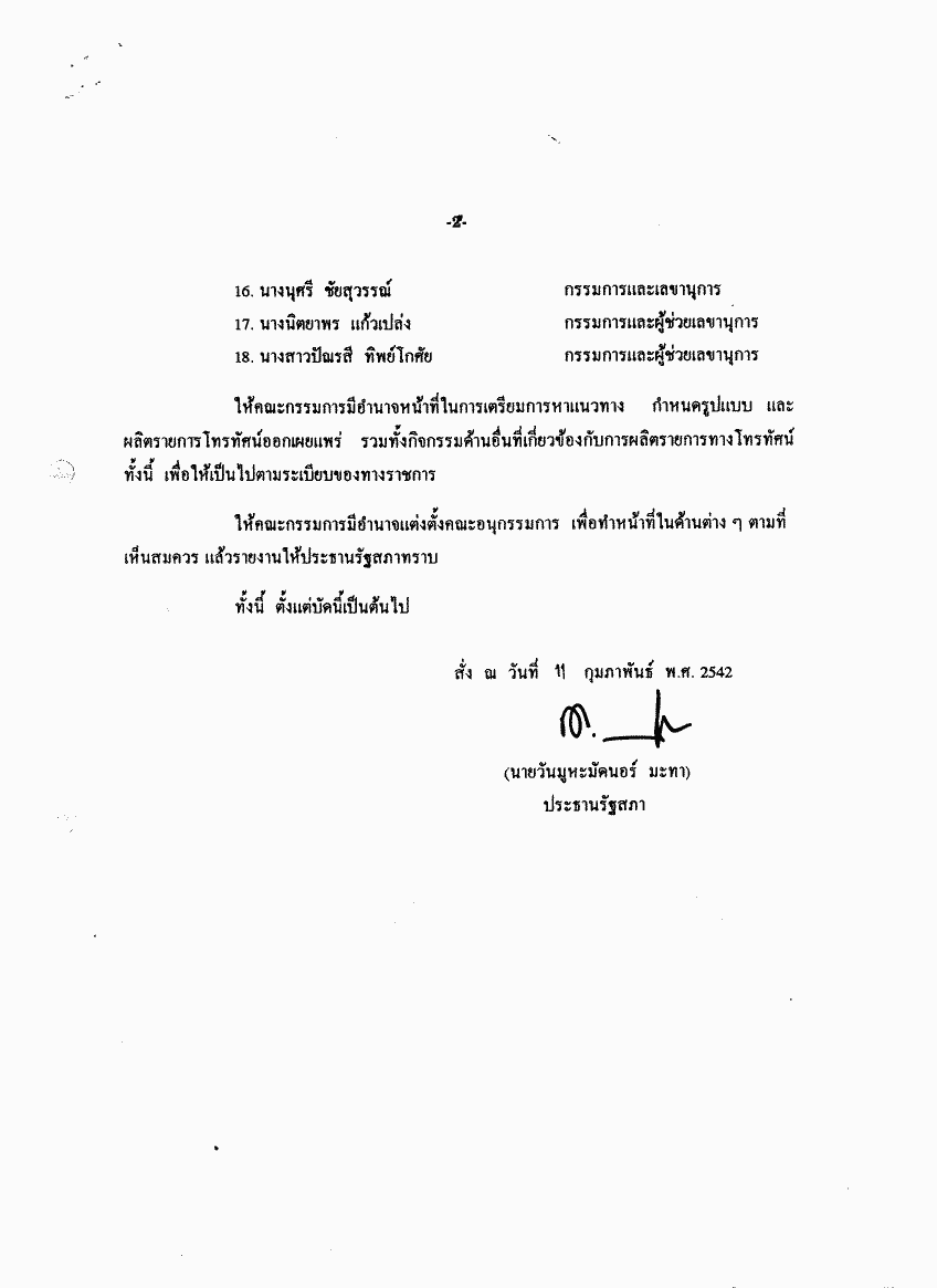 คำสั่งรัฐสภา ที่ 7 /2542 เรื่อง แต่งตั้งคณะกรรมการผลิตรายการโทรทัศน์รัฐสภา |
