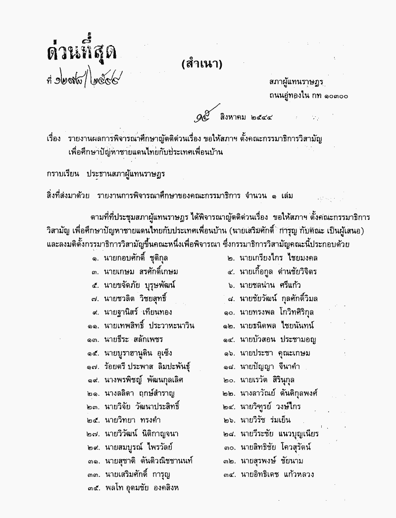 รายงานผลการพิจารณาศึกษาญัตติด่วนเรื่อง ขอให้สภาฯ ตั้งคณะกรรมาธิการวิสามัญเพื่อศึกษาปัญหาชายแดนไทยกับประเทศเพื่อนบ้าน