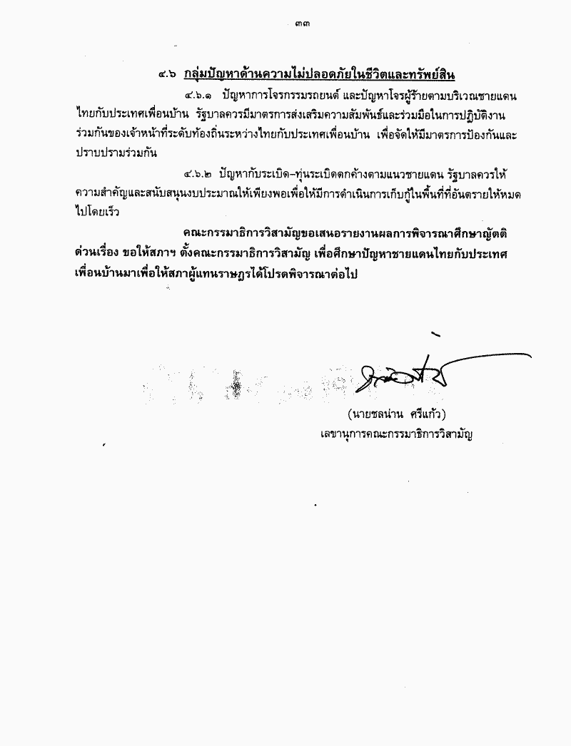 รายงานผลการพิจารณาศึกษาปัญหาชายแดนไทยกับประเทศเพื่อนบ้านซึ่งคณะกรรมาธิการวิสามัญพิจารณาเสร็จแล้ว