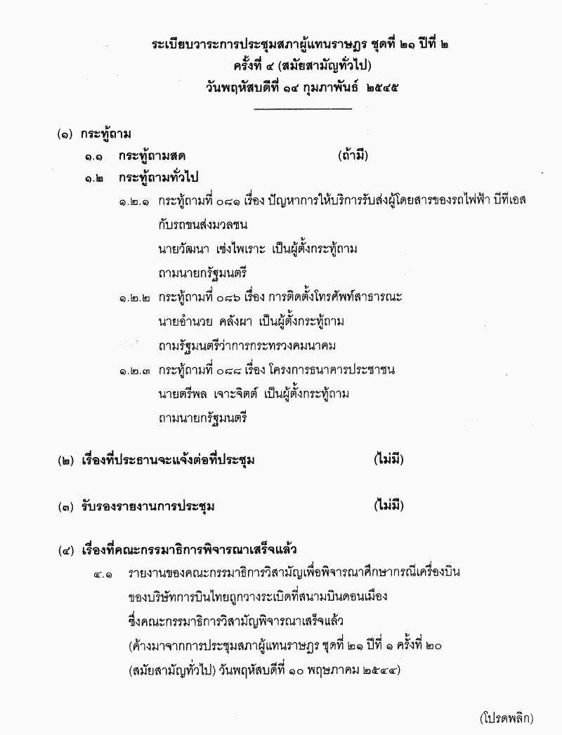 • ระเบียบวาระการประชุมสภาผู้แทนราษฎร ชุดที่ 21 ปีที่ 2 ครั้งที่ 4 (สมัยสามัญทั่วไป) วันพฤหัสบดีที่ 14 กุมภาพันธ์ 2545