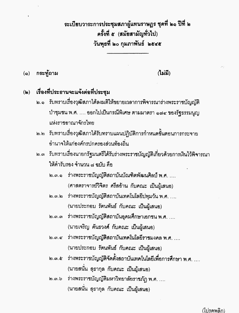 • ระเบียบวาระการประชุมสภาผู้แทนราษฎร ชุดที่ 21 ปีที่ 2 ครั้งที่ 5 (สมัยสามัญทั่วไป) วันพุธที่ 20 กุมภาพันธ์ 2545