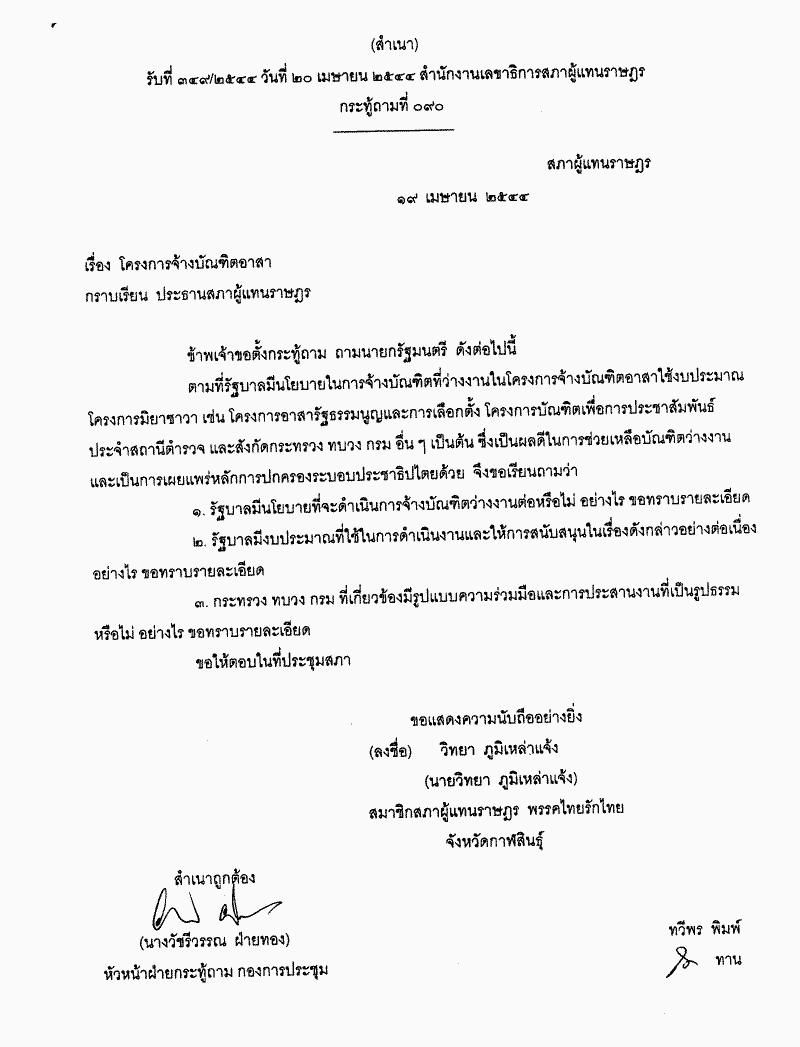 ชื่อเอกสาร : กระทู้ถามที่ 090 เรื่อง โครงการจ้างบัณฑิตอาสานายวิทยา ภูมิเหล่าแจ้ง เป็นผู้ตั้งกระทู้ถาม ถาม นายกรัฐมนตรี