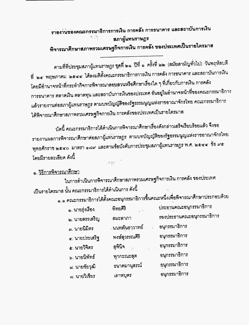 รายงานผลการพิจารณาศึกษาสภาพรวมเศรษฐกิจการเงิน การคลัง ของประเทศเป็นรายไตรมาส
