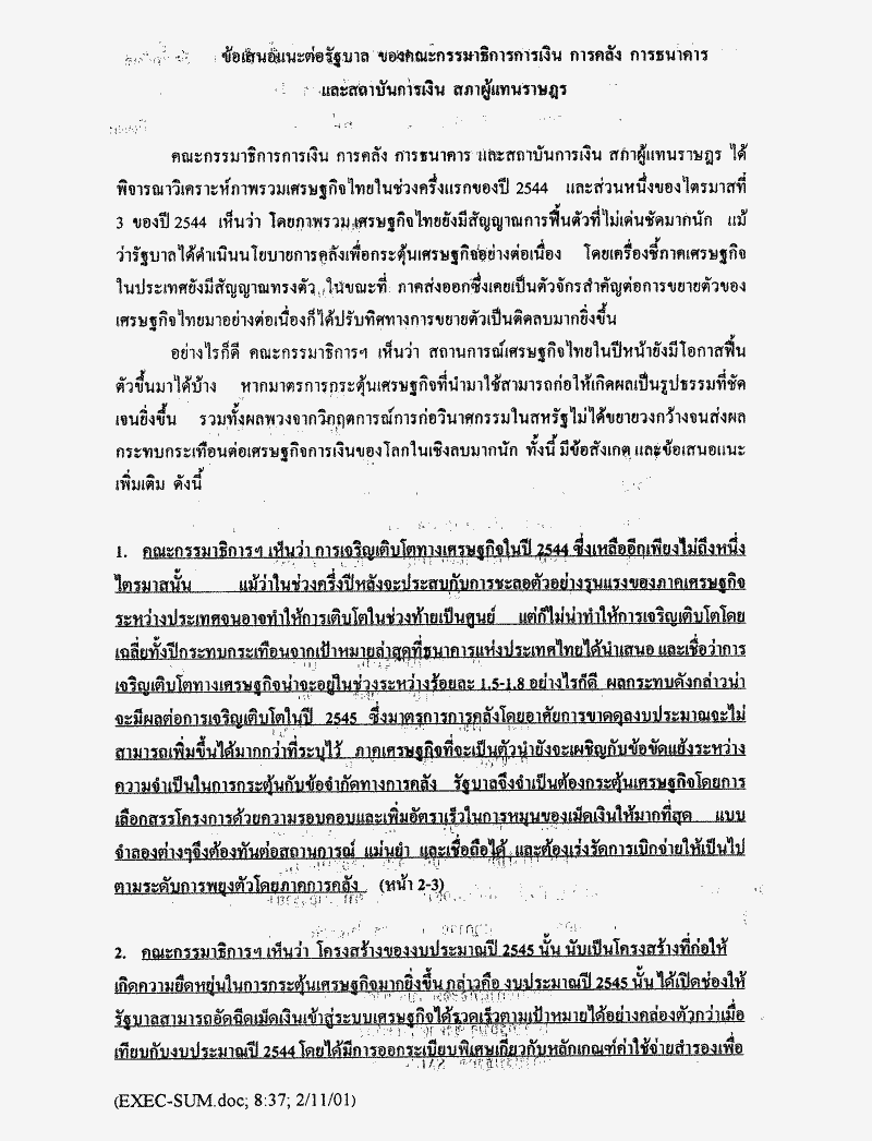 รายงานผลการพิจารณาศึกษาสภาพรวมเศรษฐกิจการเงิน การคลัง ของประเทศเป็นรายไตรมาส