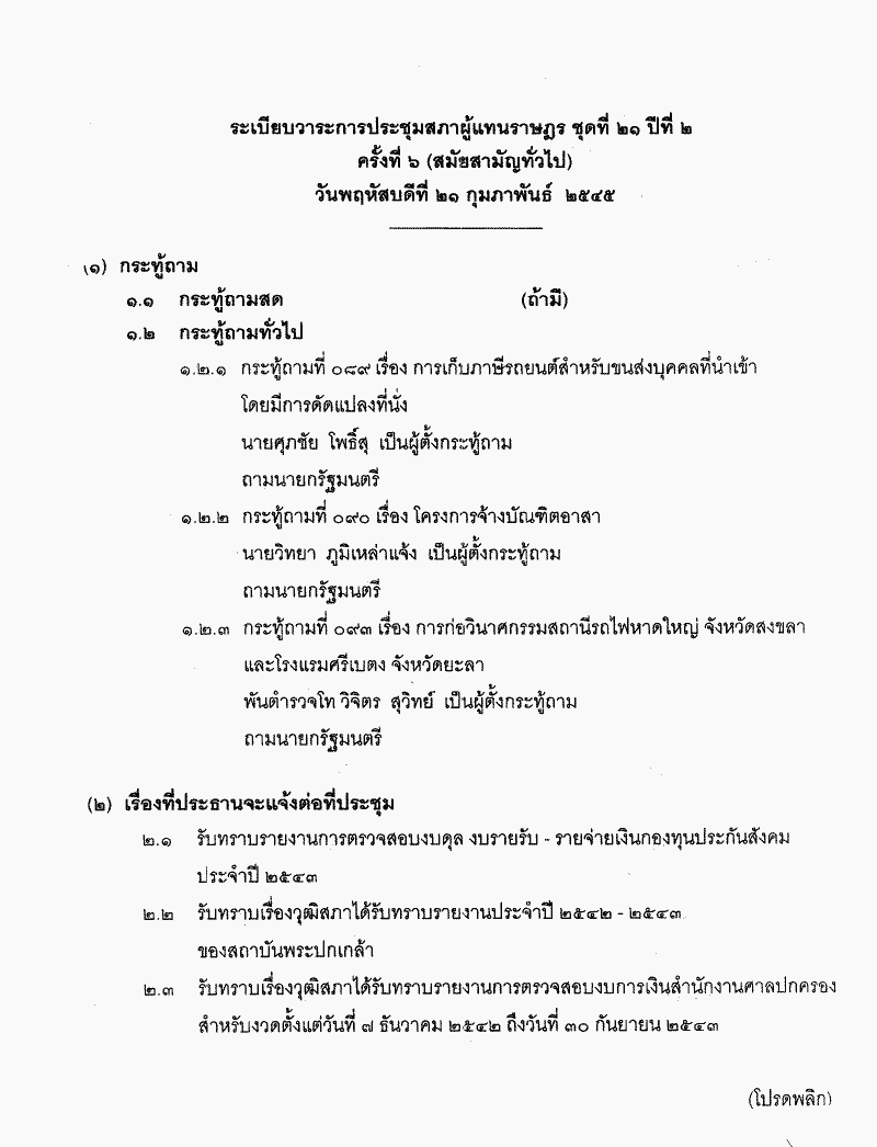 • ระเบียบวาระการประชุมสภาผู้แทนราษฎร ชุดที่ 21 ปีที่ 2 ครั้งที่ 6 (สมัยสามัญทั่วไป) วันพฤหัสบดีที่ 21 กุมภาพันธ์ 2545