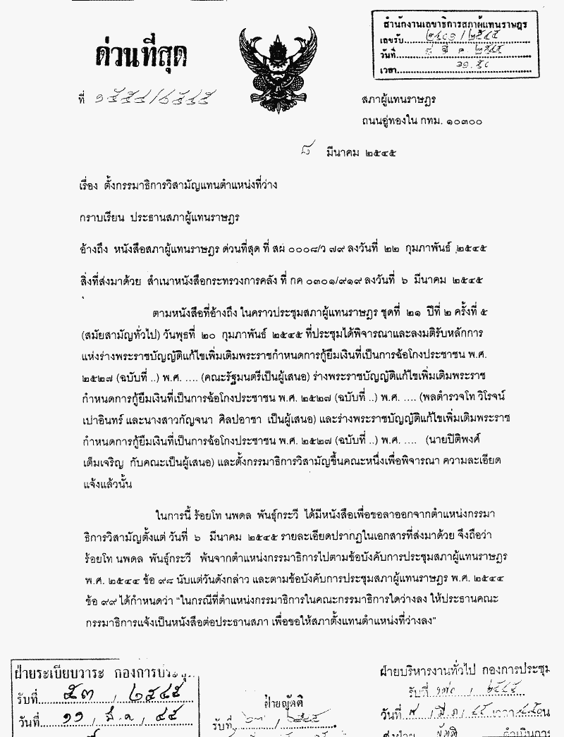 ตั้งซ่อมกรรมาธิการวิสามัญพิจารณาร่างพระราชบัญญัติแก้ไขเพิ่มเติมพระราชกำหนด การยืมเงินที่เป็นการฉ้อโกงประชาชนพ.ศ. 2527 (ฉบับที่..) พ.ศ..... แทนตำแหน่งที่ว่างลง 1 ตำแหน่ง เพราะลาออก (ร้อยโท นพดล พันธุ์กระวี) |