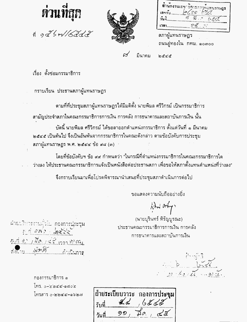 ตั้งซ่อมกรรมาธิการสามัญประจำสภา ในคณะกรรมาธิการการเงิน การคลัง การธนาคาร และสถาบันการเงิน แทนตำแหน่งที่ว่างลง 1 ตำแหน่ง เพราะลาออก (นายพิมล ศรีวิกรม์) |