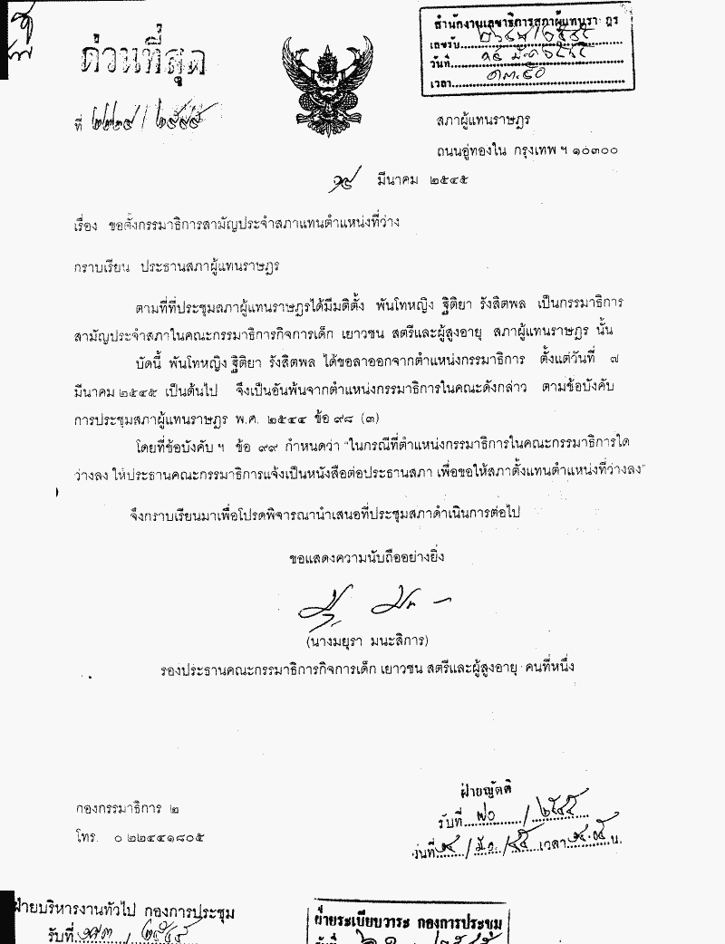 ตั้งซ่อมกรรมาธิการสามัญประจำสภา ในคณะกรรมาธิการกิจการเด็ก เยาวชน สตรี และผู้สูงอายุ แทนตำแหน่งที่ว่างลง 4 ตำแหน่ง เพราะสมาชิกภาพสิ้นสุดลงและลาออก (นางกรรณิกา ธรรมเกษร นางพิมพา จันทร์ประสงค์ นางสาวอรดี สุทธศรี และ พันโทหญิง ฐิติยา รังสิตพล) |