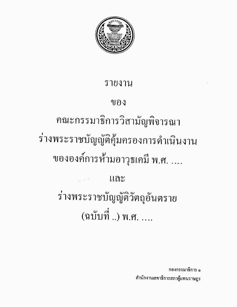 ชื่อเอกสาร :   ร่างพระราชบัญญัติคุ้มครองการดำเนินงานขององค์การห้ามอาวุธเคมี พ.ศ. .... ซึ่งคณะกรรมาธิการวิสามัญพิจารณาเสร็จแล้ว