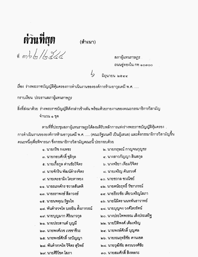 ร่างพระราชบัญญัติคุ้มครองการดำเนินงานขององค์การห้ามอาวุธเคมี พ.ศ. .... ซึ่งคณะกรรมาธิการวิสามัญพิจารณาเสร็จแล้ว |