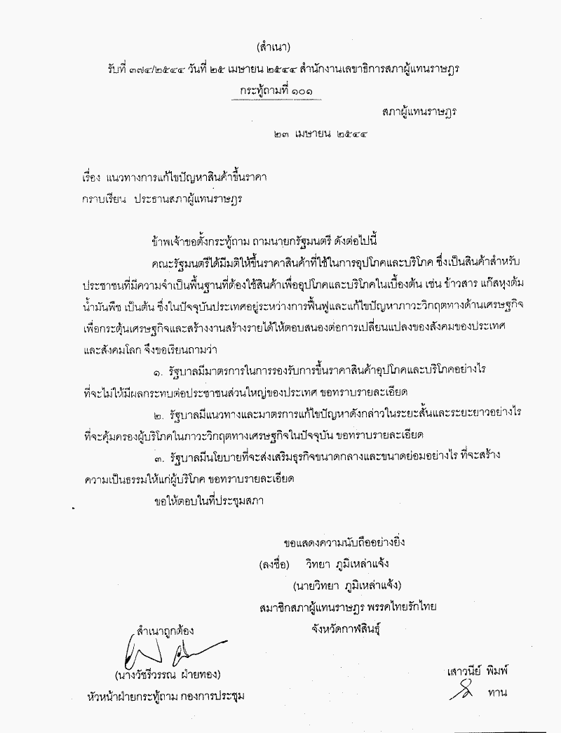 กระทู้ถามที่ 101 เรื่อง แนวทางการแก้ไขปัญหาสินค้าขึ้นราคา นายวิทยา ภูมิเหล่าแจ้ง เป็นผู้ตั้งกระทู้ถาม ถามนายกรัฐมนตรี |