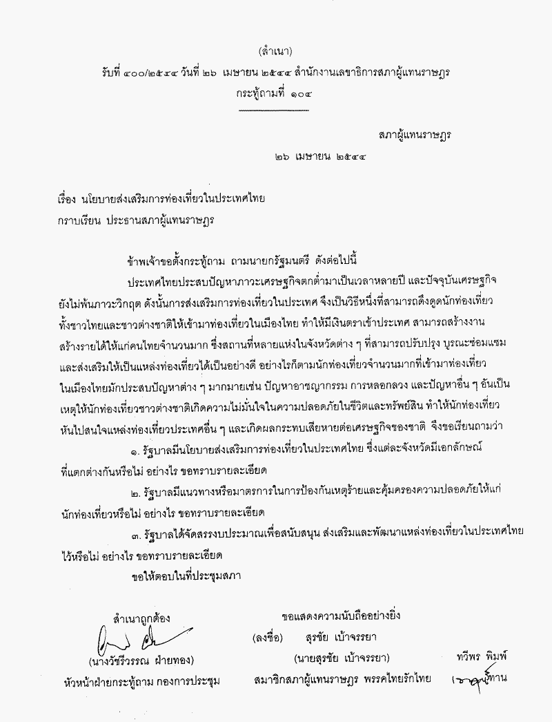 กระทู้ถามที่ 104 เรื่อง นโยบายส่งเสริมการท่องเที่ยวในประเทศไทย นายสุชัย เป้าจรรยา เป็นผู้ตั้งกระทู้ถาม ถามนายกรัฐมนตรี |