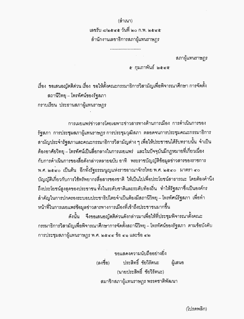 • ขอเสนอญัตติด่วน เรื่อง ขอให้ตั้งคณะกรรมาธิการวิสามัญเพื่อพิจารณาศึกษาการจัดตั้งสถานีวิทยุ-โทรทัศน์ของรัฐสภา
