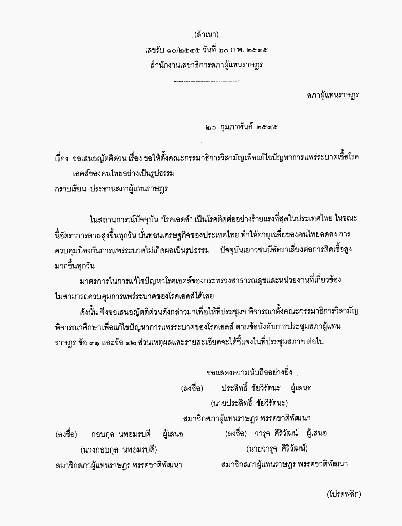 • ขอเสนอญัตติด่วน เรื่อง ขอให้ตั้งกรรมาธิการวิสามัญเพื่อแก้ไขปัญหาการณแพร่ระบาดเชื้อโรคเอดส์ของคนไทยอย่างเป็นรูปธรรม