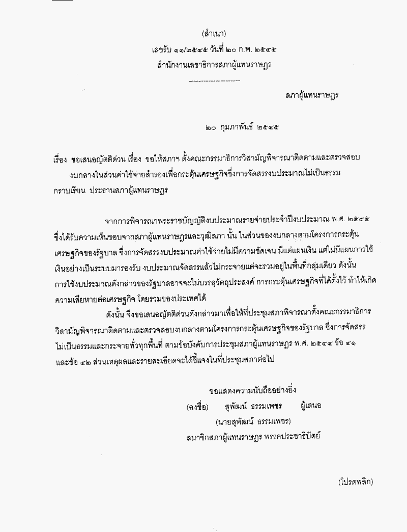 ชื่อเอกสาร :   ญัตติ เรื่อง ขอให้สภาฯ ตั้งคณะกรรมาธิการวิสามัญพิจารณาติดตามและตรวจสอบงบกลางในส่วนค่าใช้จ่ายสำรองเพื่อกระตุ้นเศรษฐกิจ การจัดสรรงบประมาณไม่เป็นธรรม (นายสุพัฒน์ ธรรมเพชร เป็นผู้เสนอ)