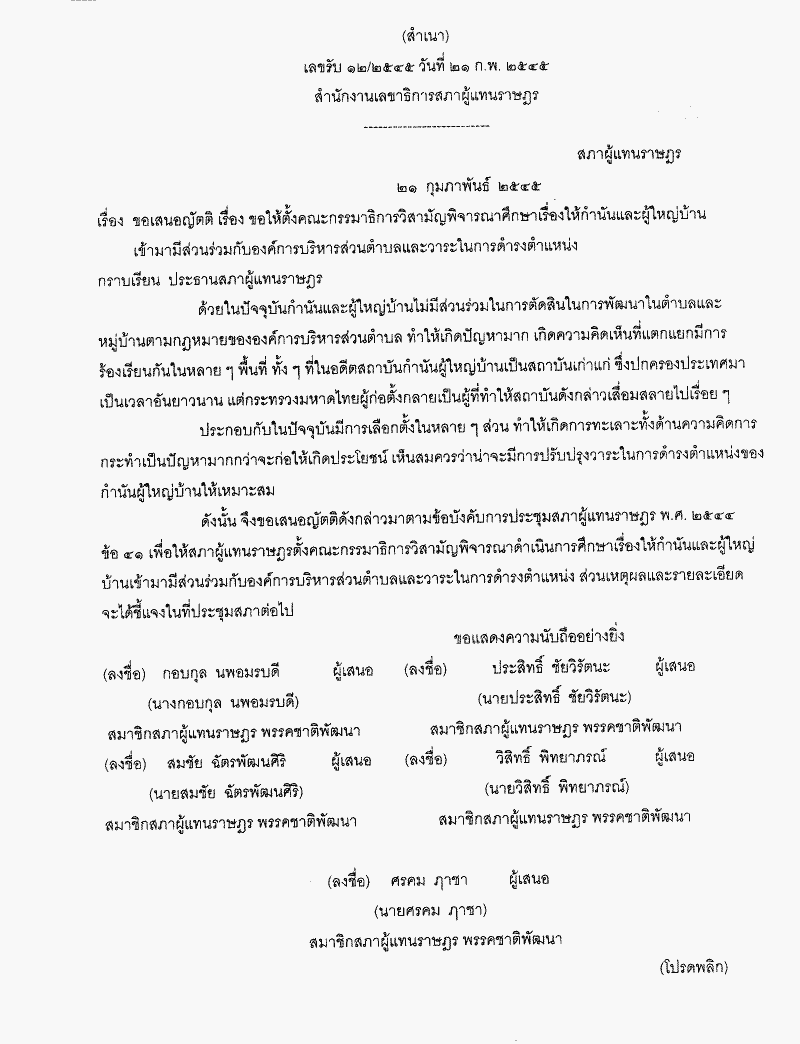 ญัตติ เรื่อง ขอให้ตั้งคณะกรรมาธิการวิสามัญพิจารณาศึกษาเรื่องให้กำนันและผู้ใหญ่บ้านเข้ามามีส่วนร่วมกับองค์การบริหารส่วนตำบลและวาระในการดำรงตำแหน่ง (นายประสิทธิ์ ชัยวิรัตนะ กับคณะ เป็นผู้เสนอ) |