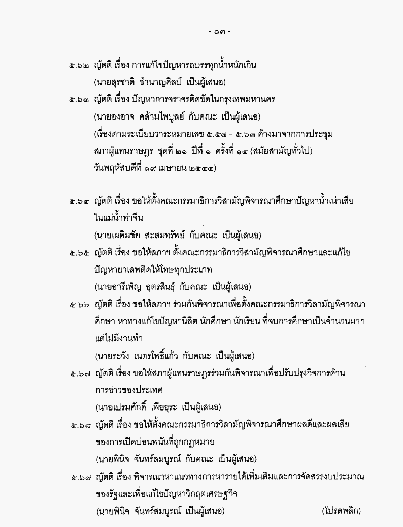 ระเบียบวาระการประชุมสภาผู้แทนราษฎร > ชุดที่ 21 > ปีที่ 2 > สมัยสามัญทั่วไป > ครั้งที่ 13