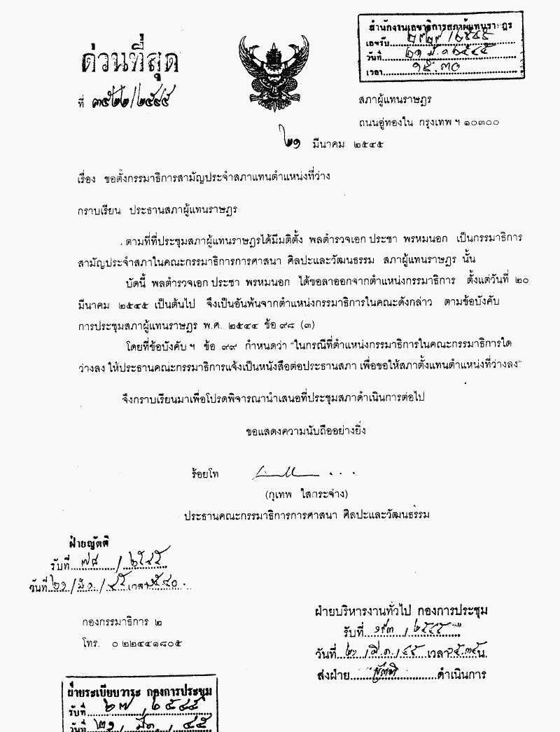 ตั้งช่อมกรรมาธิการสามัญประจำสภา ในคณะกรรมาธิการการศาสนา ศิลปะ และวัฒนธรรม แทนตำแหน่งที่ว่างลง ตำแหน่ง เพราะสมาชิกภาพสิ้นสุดลง และลาออก (นางกรรณิกา ธรรมเกษร นายณรงค์กร ชวาลสันตติ และ พลตำรวจเอก ประชา พรหมนอก) |