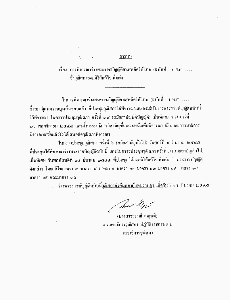 ชื่อเอกสาร :   พิจารณากรณีวุฒิสภาแก้ไขเพิ่มเติมร่างพระราชบัญญัติยาเสพติดให้โทษ (ฉบับที่..) พ.ศ..... ตามมาตรา 175 ของรัฐธรรมนูญแห่งราชอาณาจักรไทย