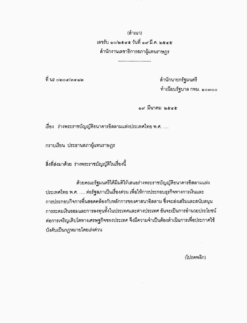 ชื่อเอกสาร :   ร่างพระราชบัญญัติธนาคารอิสลามแห่งประเทศไทย พ.ศ...... (คณะรัฐมนตรีเป็นผู้เสนอ)