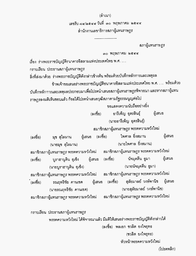 ร่างพระราชบัญญัติธนาคารอิสลามแห่งประเทศไทย พ.ศ..... (นายอารีเพ็ญ อุตรสินธุ์ กับคณะ เป็นผู้เสนอ) |