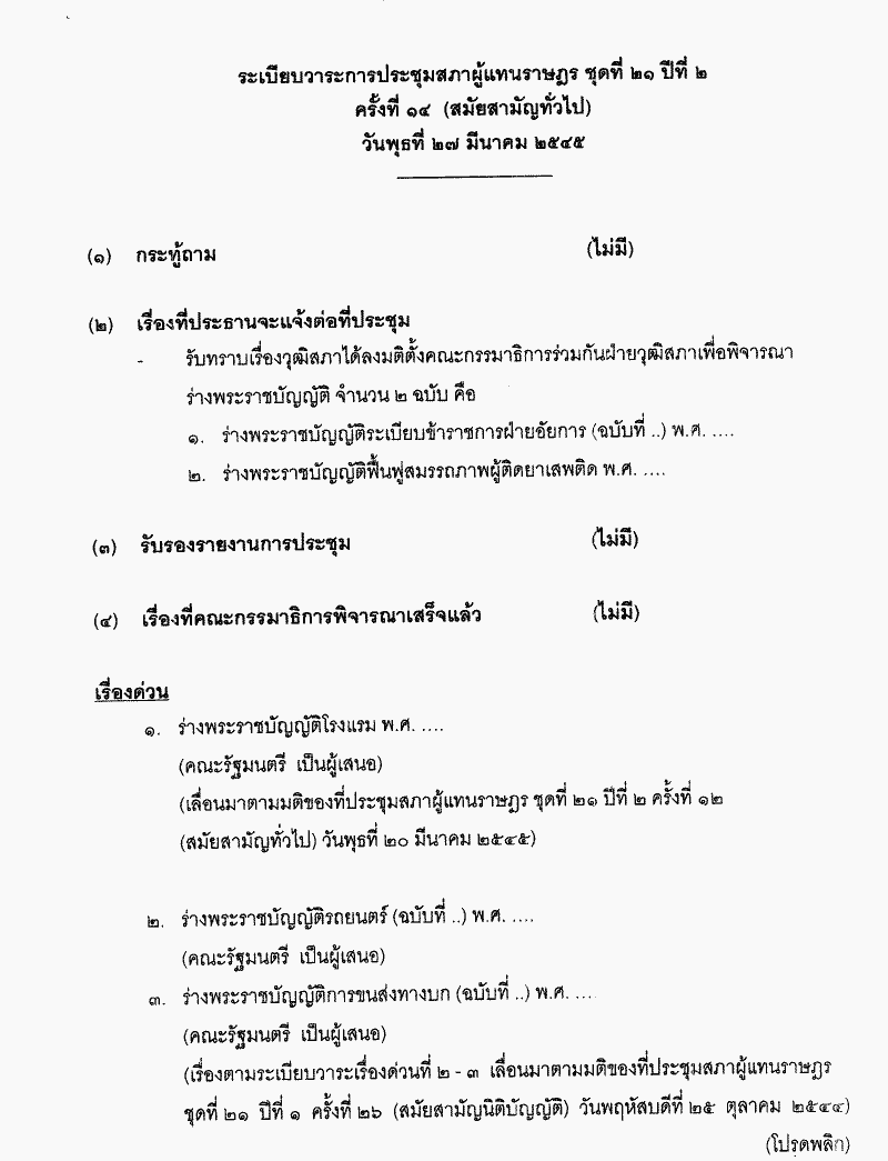 • ระเบียบวาระการประชุมสภาผู้แทนราษฎร ชุดที่ 21 ปีที่ 2 ครั้งที่ 14 (สมัยสามัญทั่วไป) วันพุธที่ 27 มีนาคม 2545
