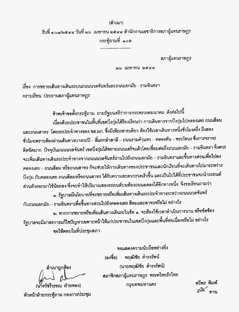 กระทู้ถามที่ 105 เรื่อง การย้ายเส้นทางเดินรถบนถนนนวลจันทร์และถนนเอกมัย -รามอินทรา นายพฤฒิชัย ดำรงรัตน์ เป็นผู้ตั้งกระทู้ถาม ถามรัฐมนตรีว่าการกระทรวงคมนาคม |