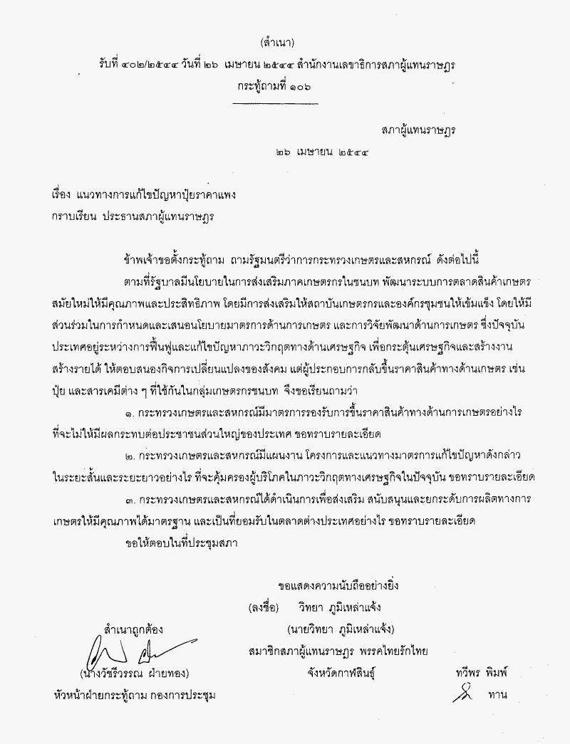 กระทู้ถามที่ 106 เรื่อง แนวทางการแก้ไขปัญหาปุ๋ยราคาแพง นายวิทยา ภูมิเหล่าแจ้ง เป็นผู้ตั้งกระทู้ถาม ถามรัฐมนตรีว่าการกระทรวงเกษตรและสหกรณ์ |