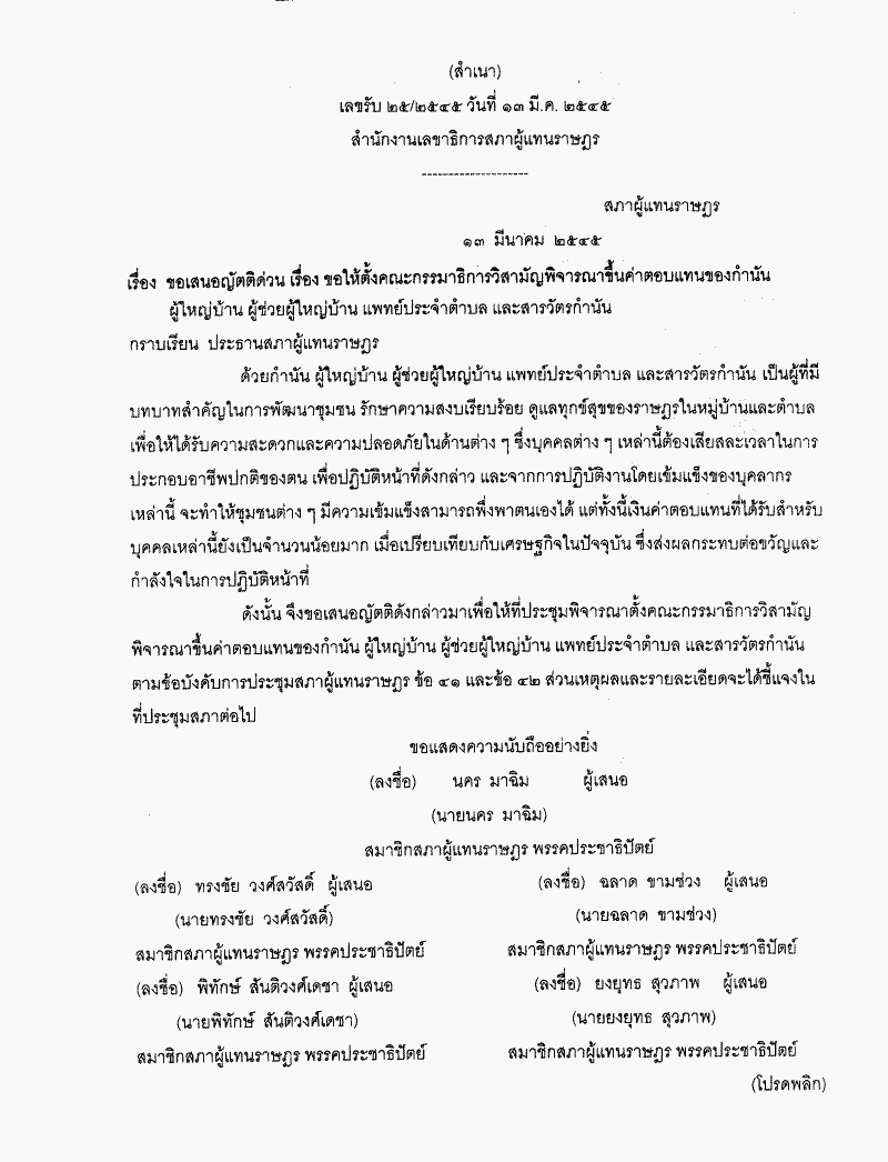 ขอเสนอญัตติด่วน เรื่อง ขอให้ตั้งคณะกรรมาธิการวิสามัญพิจารณาศึกษาขึ้นค่าตอบแทนของกำนันผู้ใหญ่บ้าน ผู้ช่วยผู้ใหญ่บ้าน แพทย์ประจำตำบล และสารวัตรกำนัน |