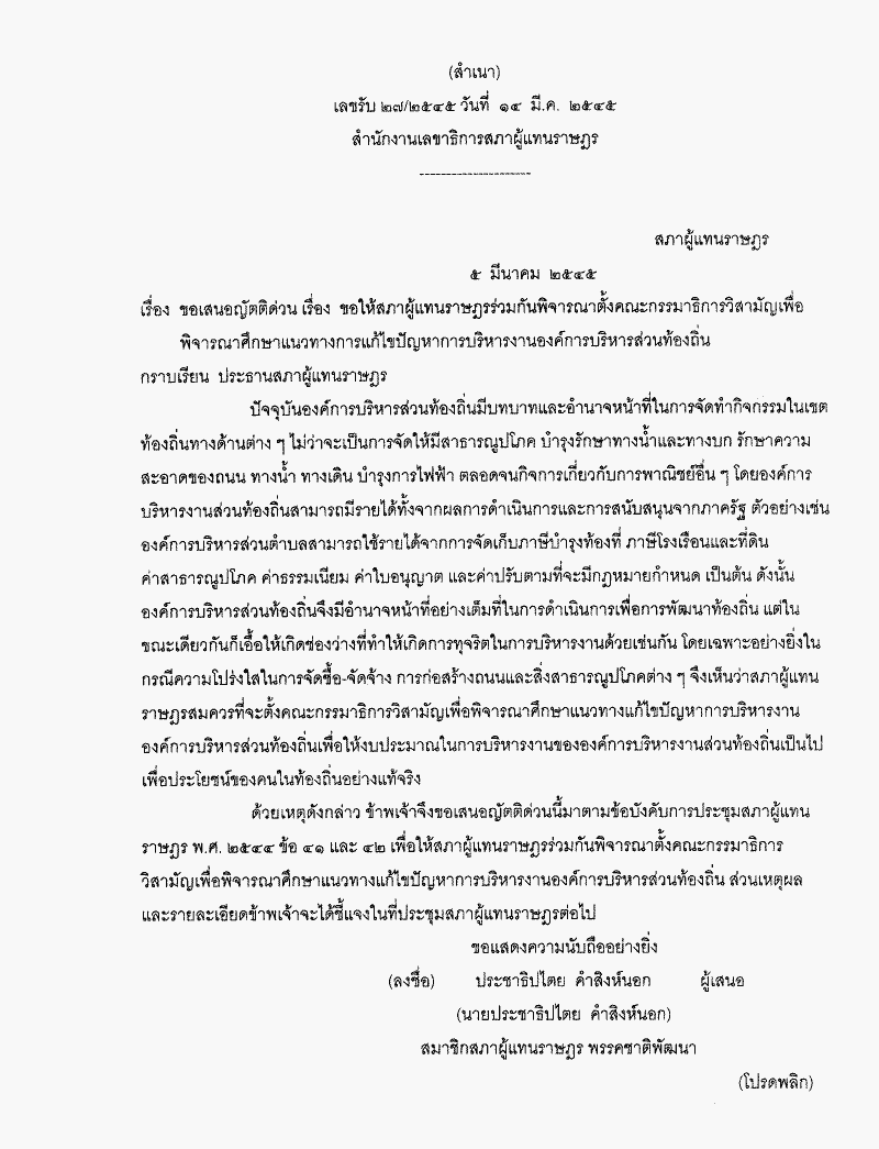 ขอเสนอญัตติด่วน เรื่อง ขอให้สภาผู้แทนราษฎรร่วมกันพิจารณาตั้งคณะกรรมาธิการวิสามัญเพื่อพิจารณาศึกษาแนวทางการแก้ไขปัญหาการบริหารงานองค์การบริหารส่วนท้องถิ่น |