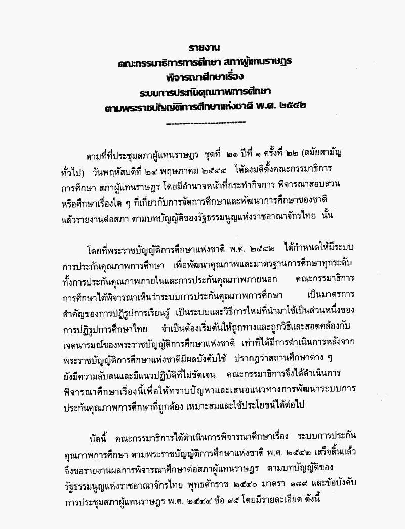 รายงานผลการพิจารณาระบบการประกันคุณภาพการศึกษาตามพระราชบัญญัติการศึกษาแห่งชาติ พ.ศ. 2542 ซึ่งคณะกรรมาธิการการศึกษาพิจารณาเสร็จแล้ว