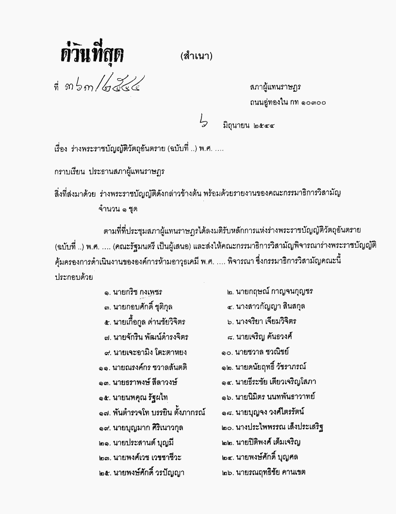 ชื่อเอกสาร :   ร่างพระราชบัญญัติวัตถุอันตราย (ฉบับที่..) พ.ศ. .... ซึ่งคณะกรรมาธิการวิสามัญพิจารณาเสร็จแล้ว