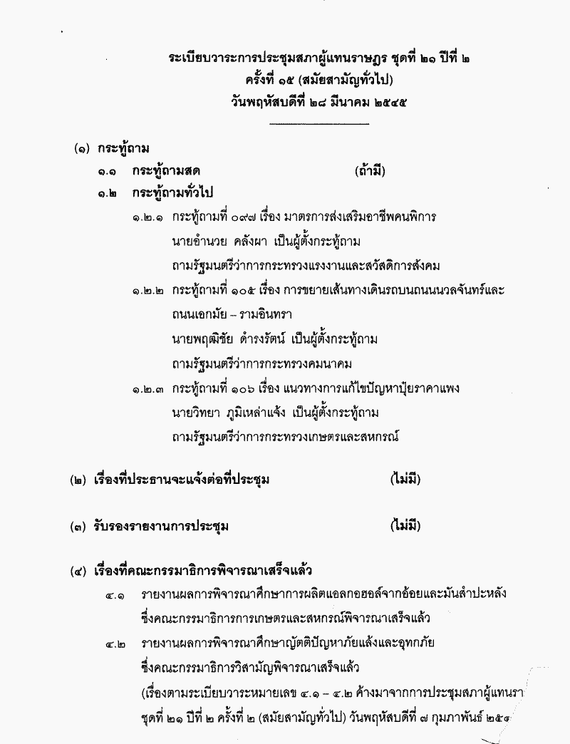• ระเบียบวาระการประชุมสภาผู้แทนราษฎร ชุดที่ 21 ปีที่ 2 ครั้งที่ 15 (สมัยสามัญทั่วไป) วันพฤหัสบดีที่ 28 มีนาคม 2545