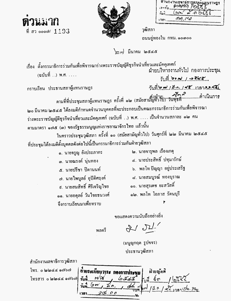 ตั้งกรรมาธิการร่วมกันเพื่อพิจารณาร่างพระราชบัญญัติธุรกิจนำเที่ยวและมัคคุเทศก์ (ฉบับที่..) พ.ศ.... |