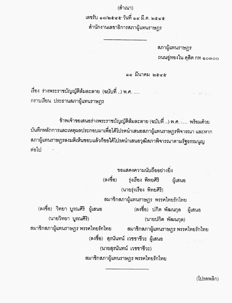 ชื่อเอกสาร :   ร่างพระราชบัญญัติล้มละลาย (ฉบับที่..) พ.ศ..... (นายรุ่งเรือง พิทยศิริ กับคณะ เป็นผู้เสนอ)