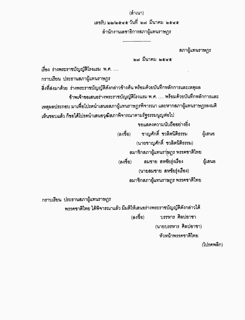 • ร่างพระราชบัญญัติโรงแรม พ.ศ..... (นายชาญสักดิ์ ชวลิตนิติธรรม และนายสมชาย สหชัยรุ่งเรือง เป็นผู้เสนอ)